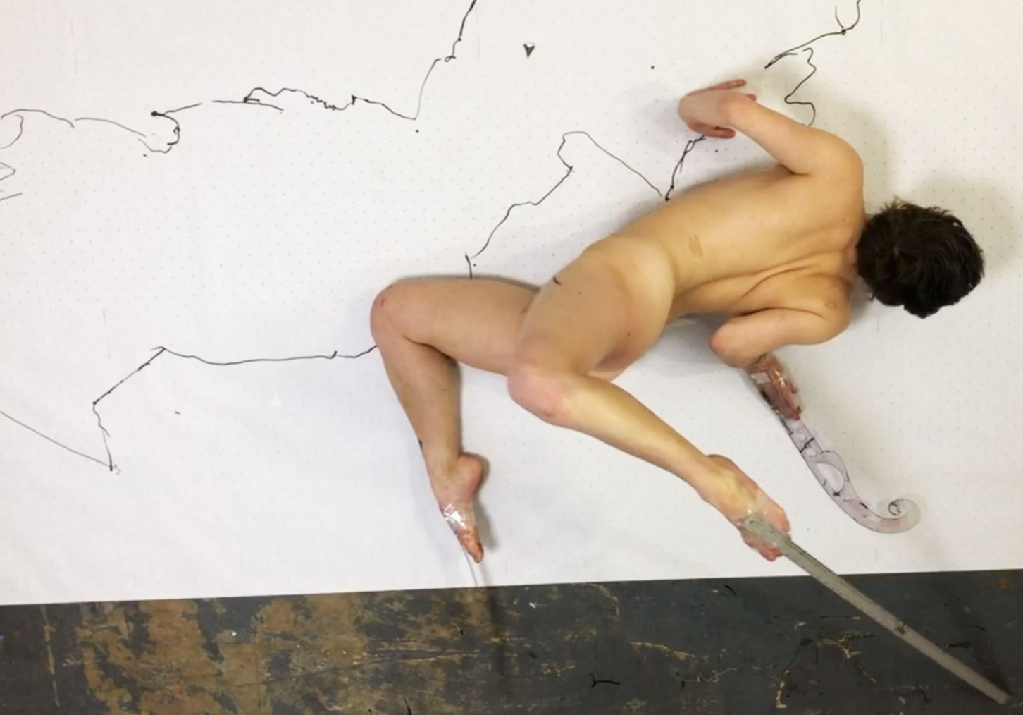 Total Annihilation destroys the construction constraints enforced by the human body. This is achieved by disrupting traditional creative pattern cutting processes, which led to a collaboration with Jūlija Ruseviča, a queer artist and dancer based in London. Julia used her body and dance movements to draw abstract patterns that were then turned into garments - she was nude to allow her body to perform freely and to be uninformed by existing attire.