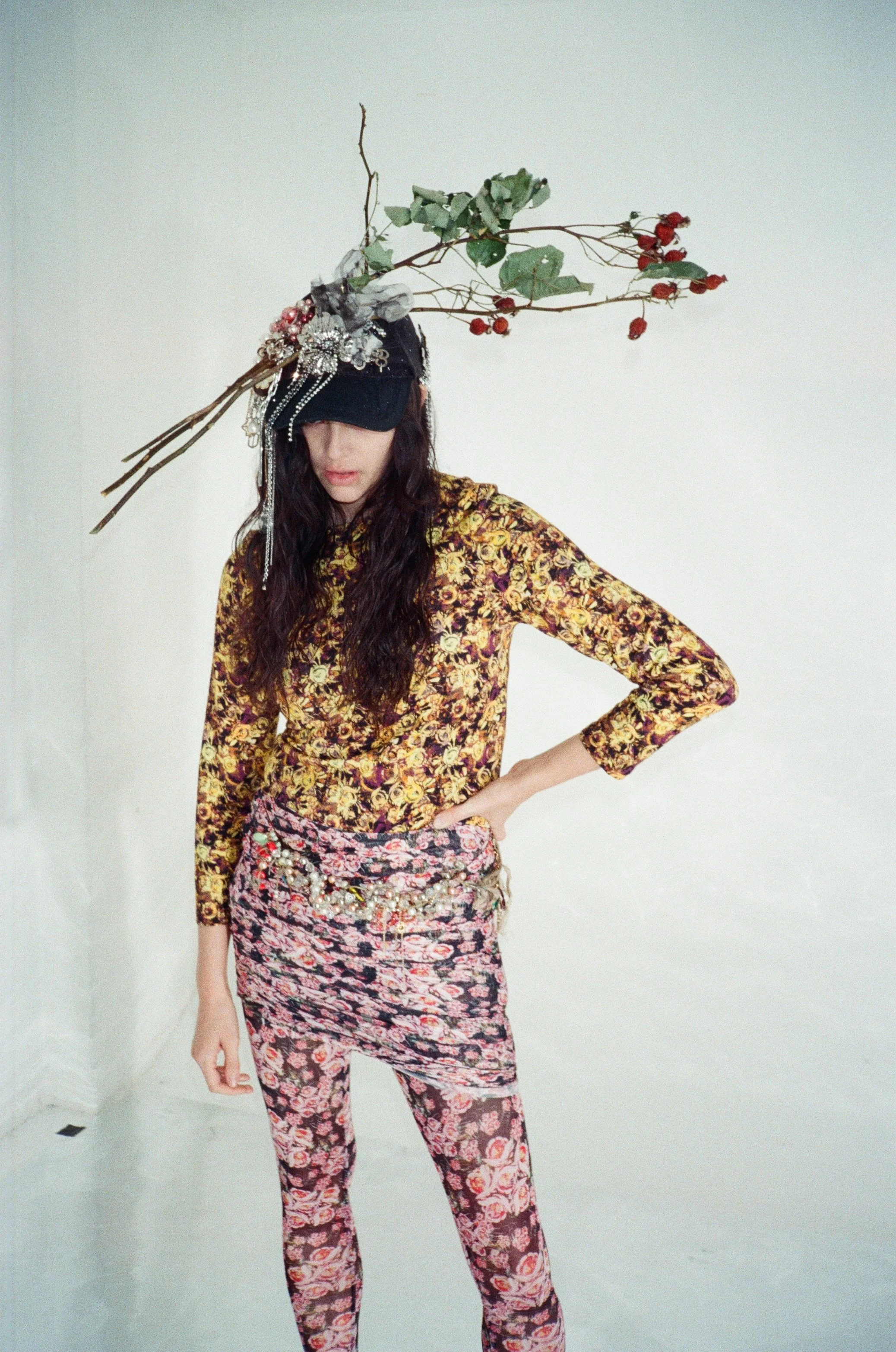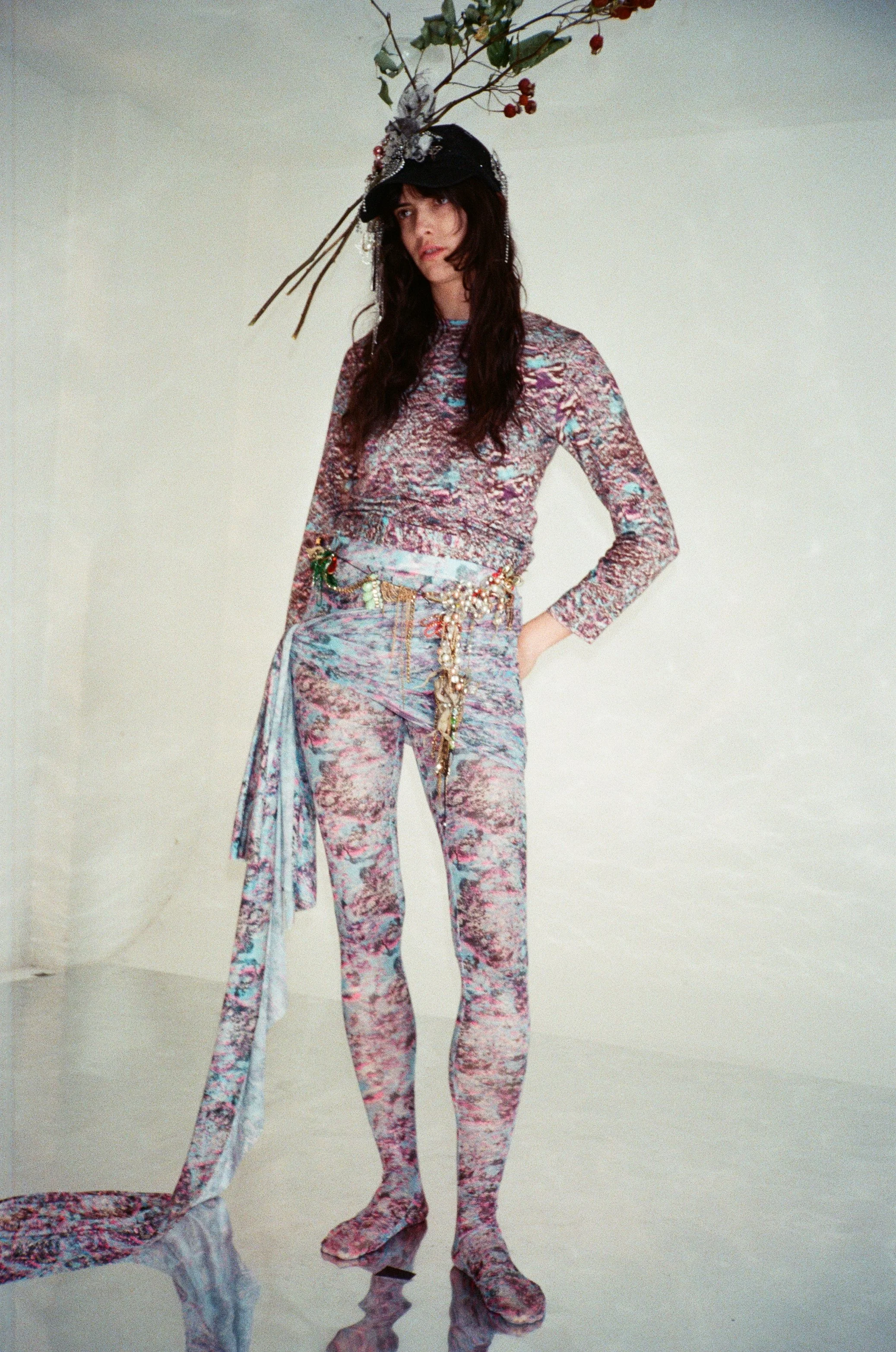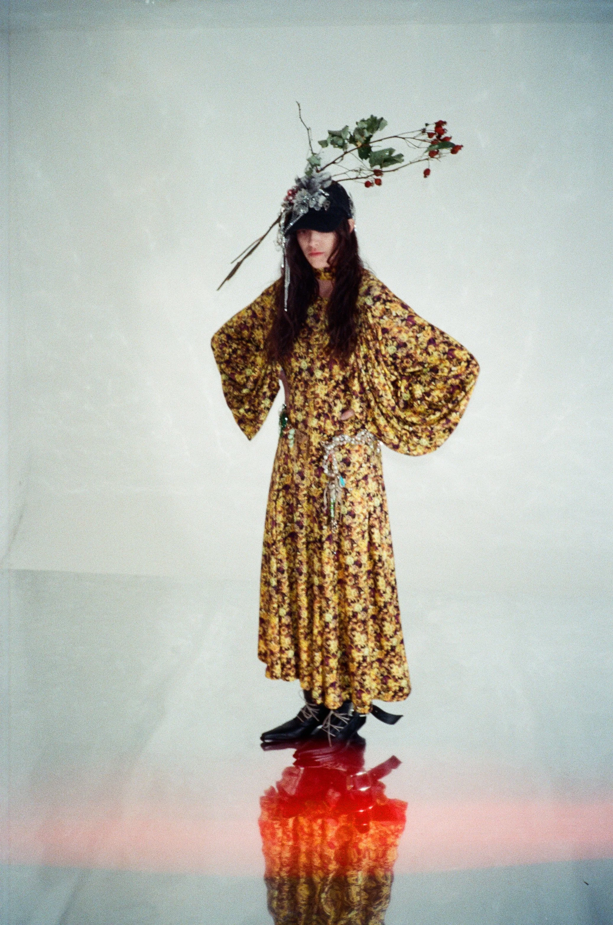 Here, ornament is not excess but endurance. The canal-boat rose — traditionally painted onto vessels built for labour and life — becomes a motif of continuity, care, and surface in motion. Prints wrap and trail across the body, while stitching and quilting translate decorative tradition into contemporary construction. Roylance reimagines this endangered craft within modern womenswear, where heritage is carried forward lightly, and beauty is shaped by passage rather than permanence.