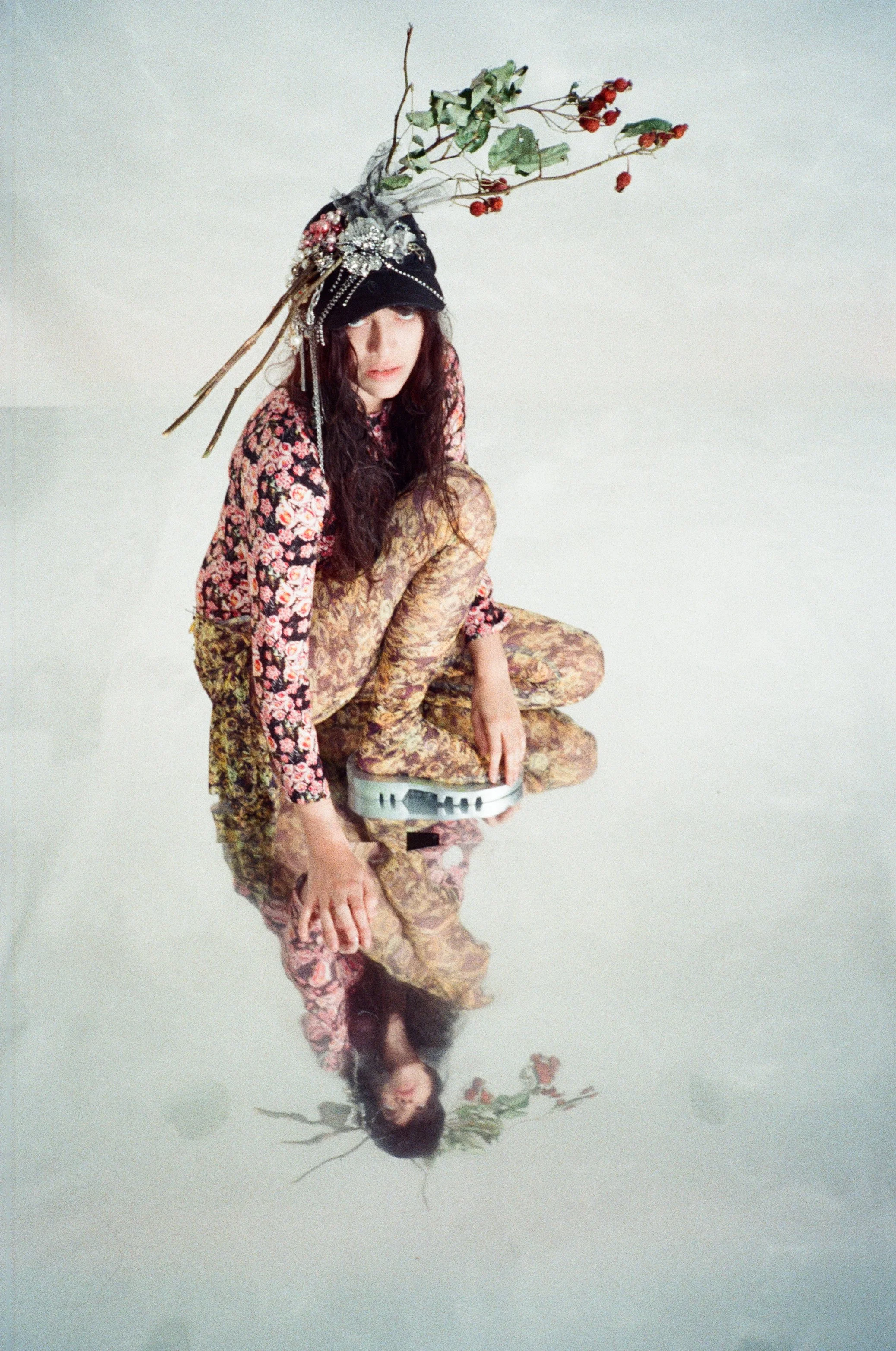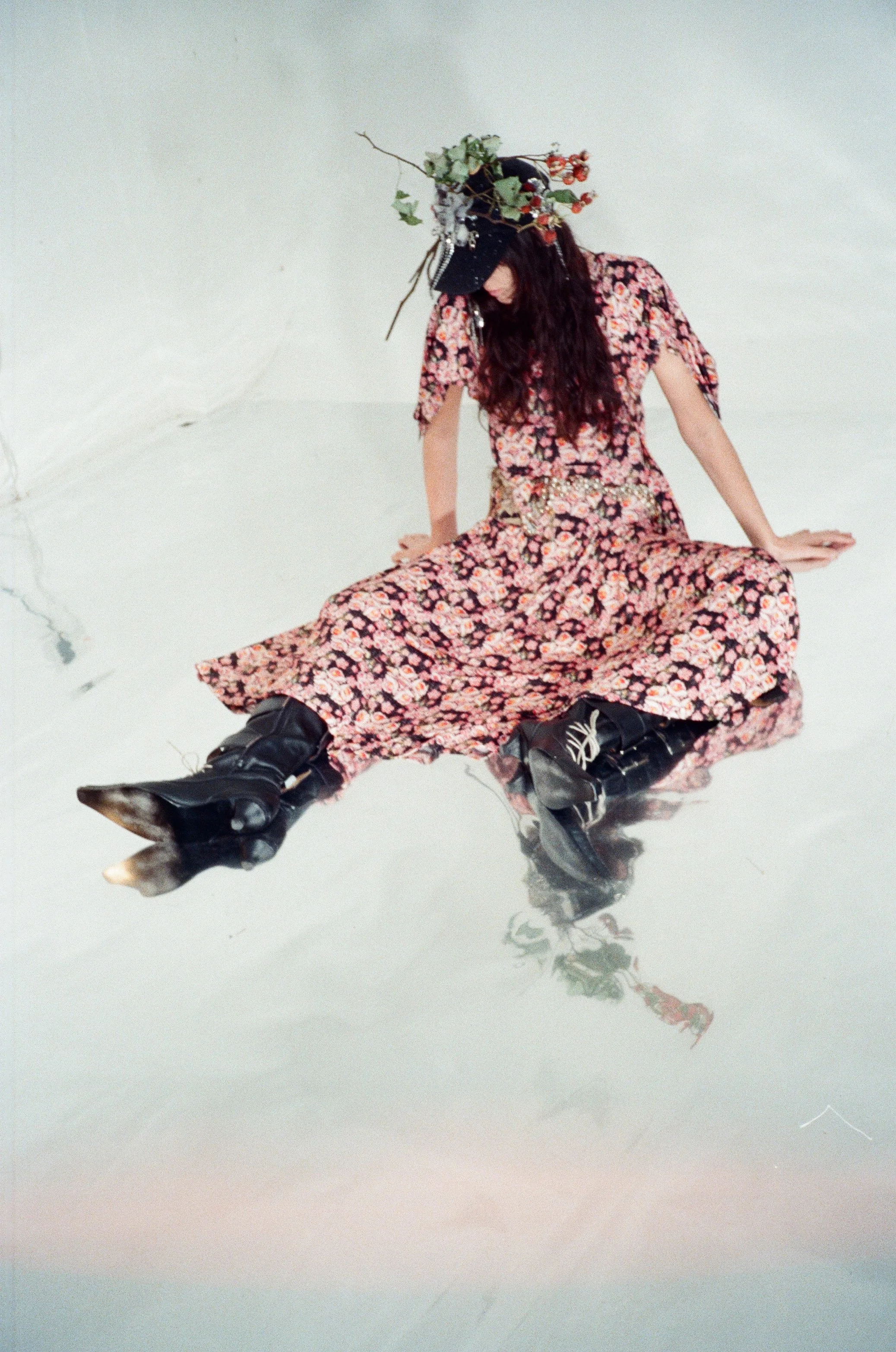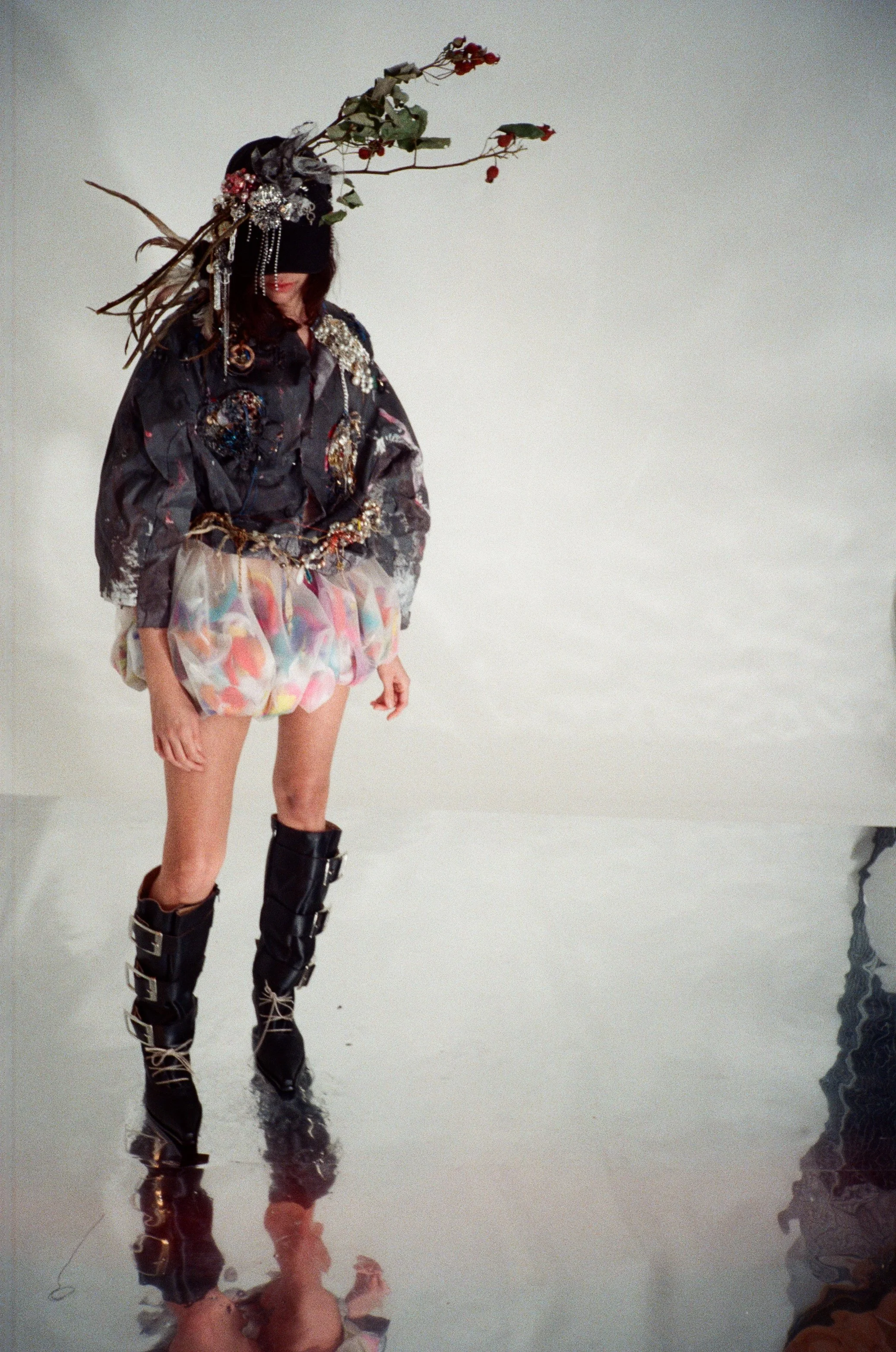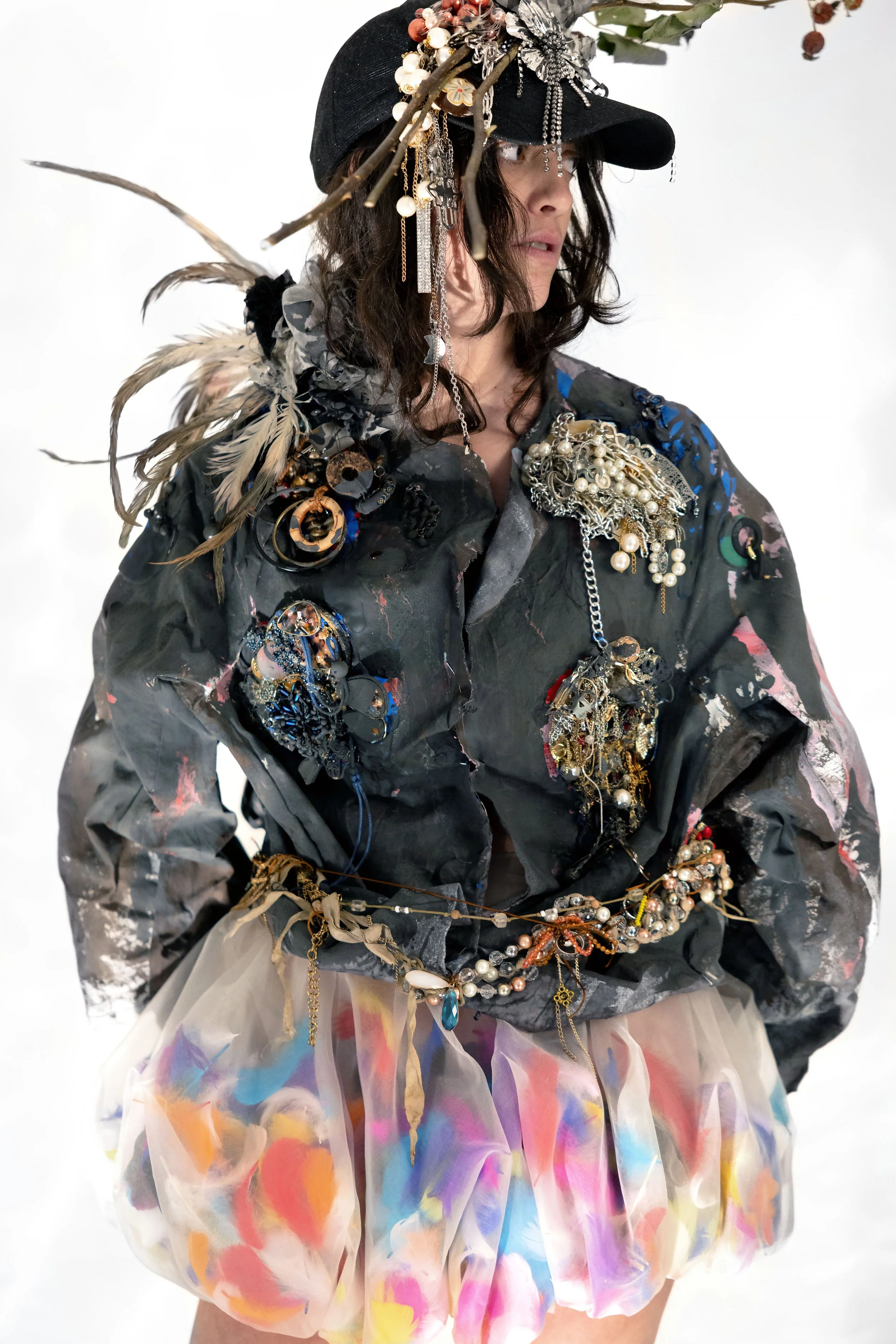 Here, ornament is not excess but endurance. The canal-boat rose — traditionally painted onto vessels built for labour and life — becomes a motif of continuity, care, and surface in motion. Prints wrap and trail across the body, while stitching and quilting translate decorative tradition into contemporary construction. Roylance reimagines this endangered craft within modern womenswear, where heritage is carried forward lightly, and beauty is shaped by passage rather than permanence.