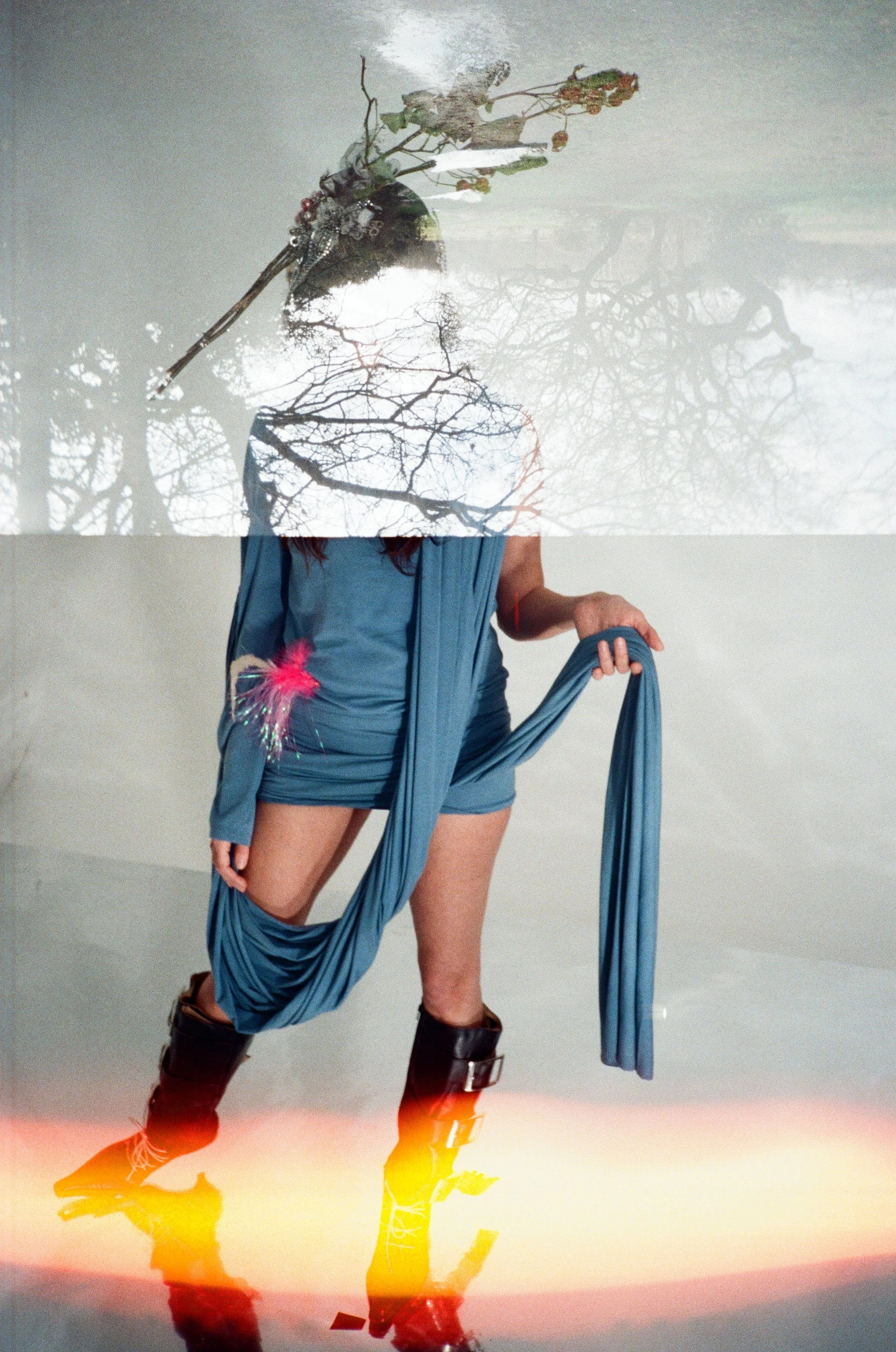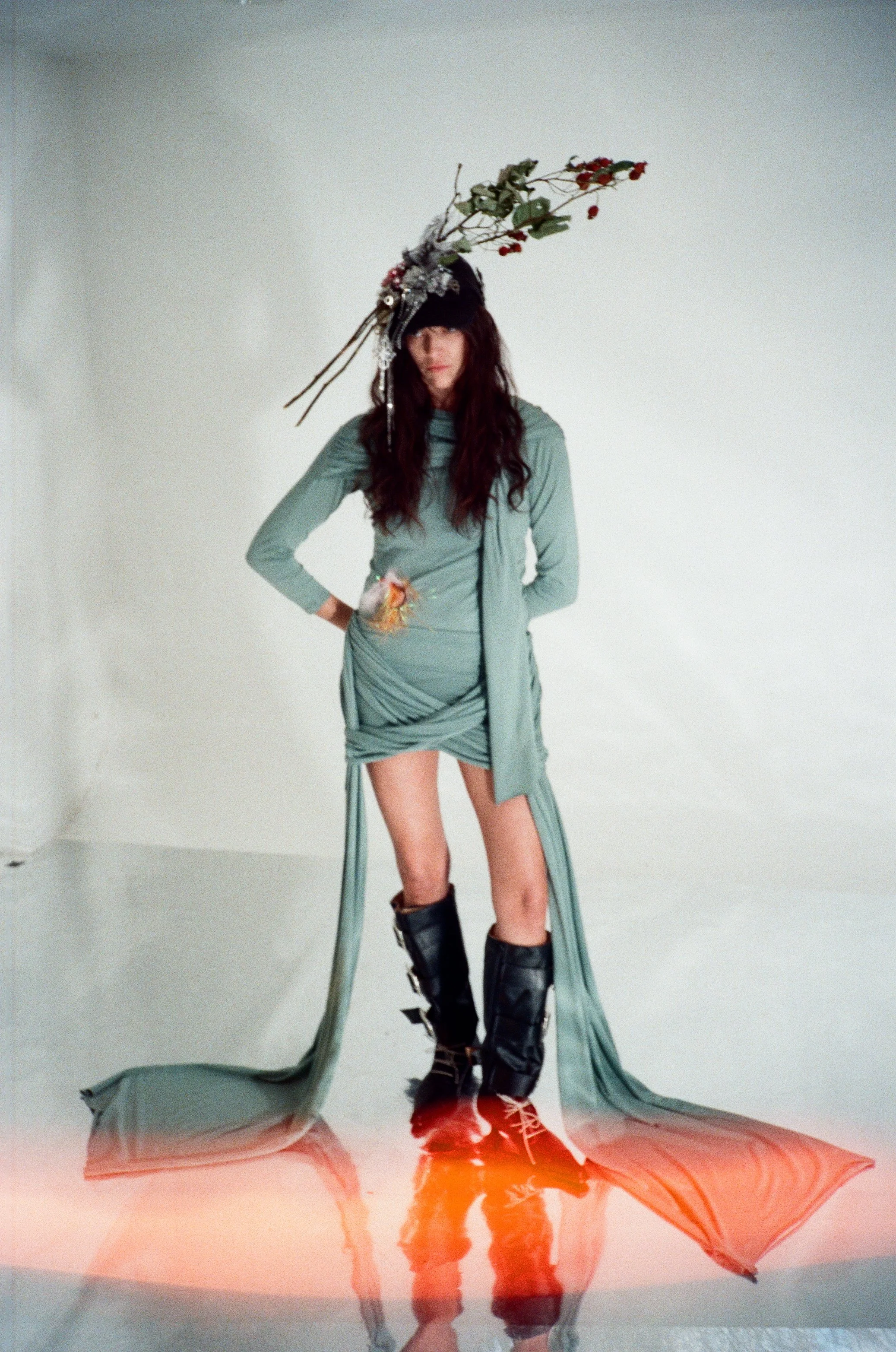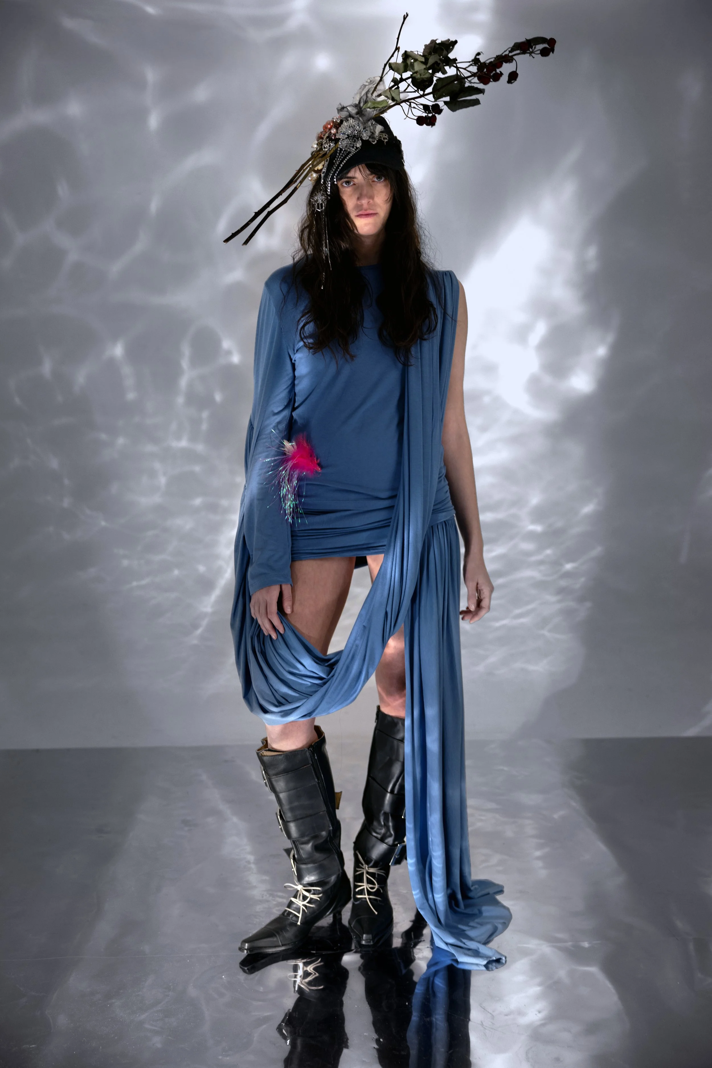 Inspired by long summer cycles through the Walthamstow Marshes during the heatwaves of 2025, the collection reflects a landscape of stillness and motion — working water, drifting light, and lives lived along the canal’s edge. Garments echo this rhythm through fluid dresses, bias-cut layers, second-skin printed pieces, and softly structured pieces. Quilted jackets and coats carry the weight of the collection, while sheer jerseys and lightweight wovens introduce breathability and ease.